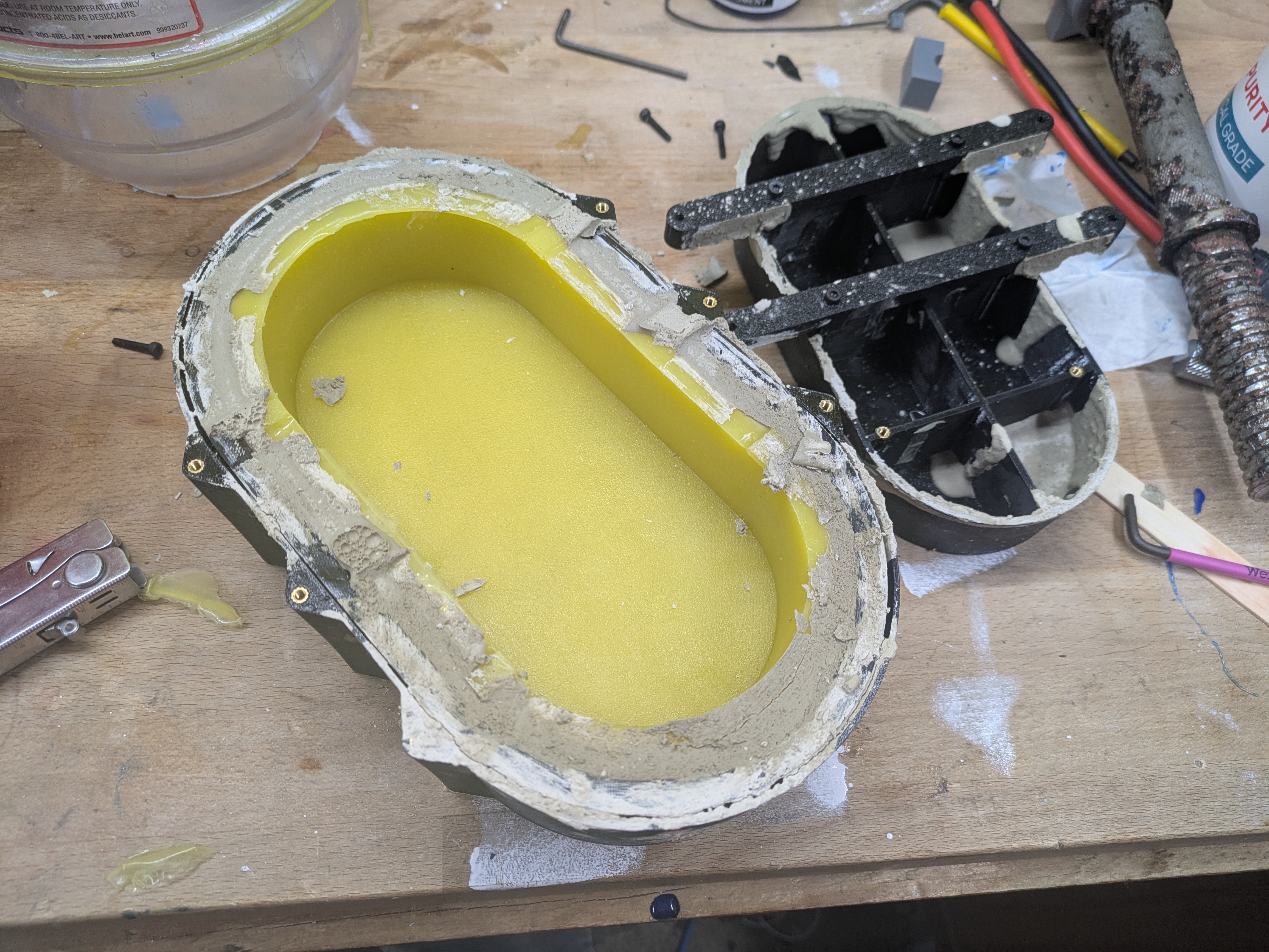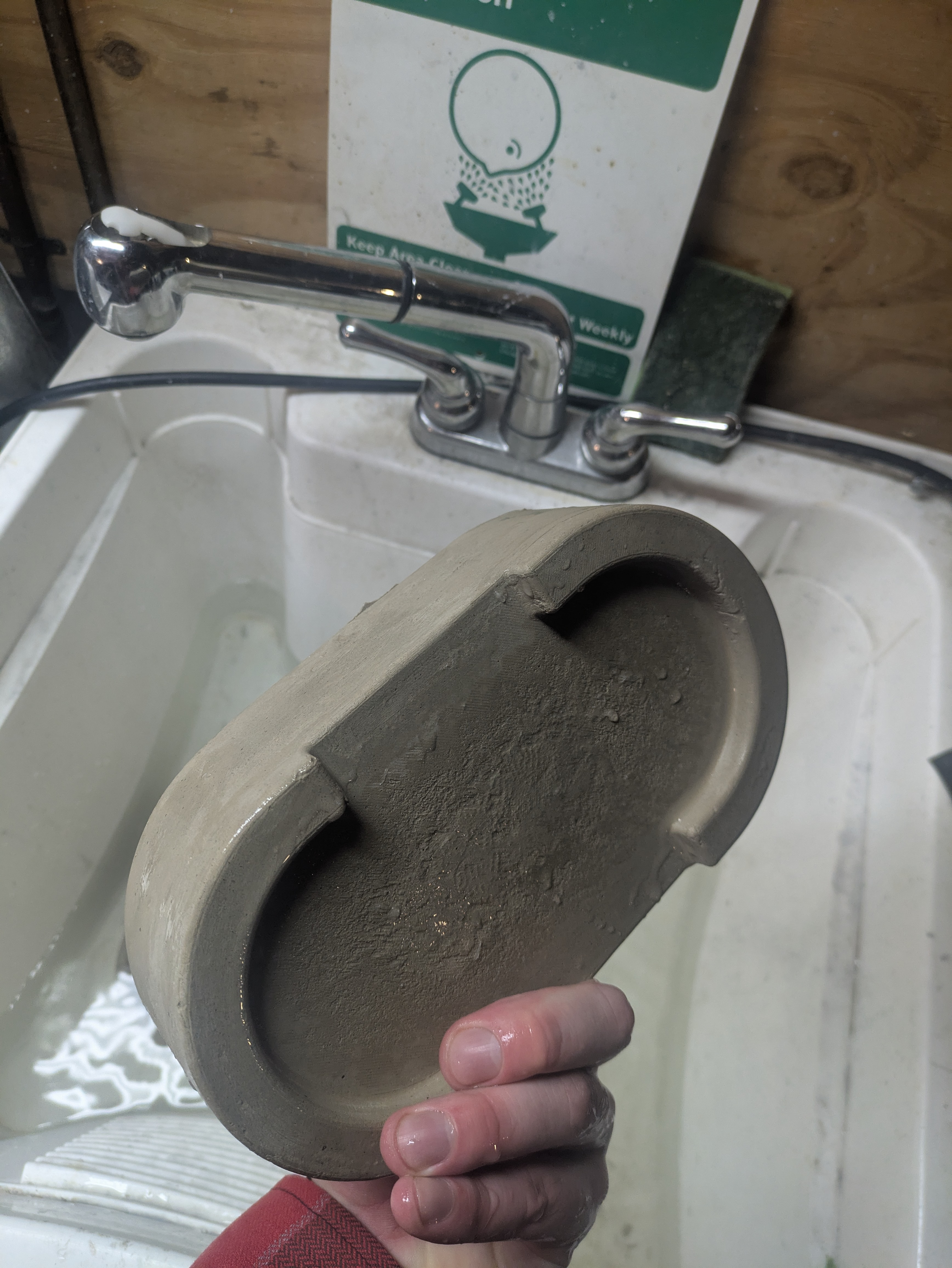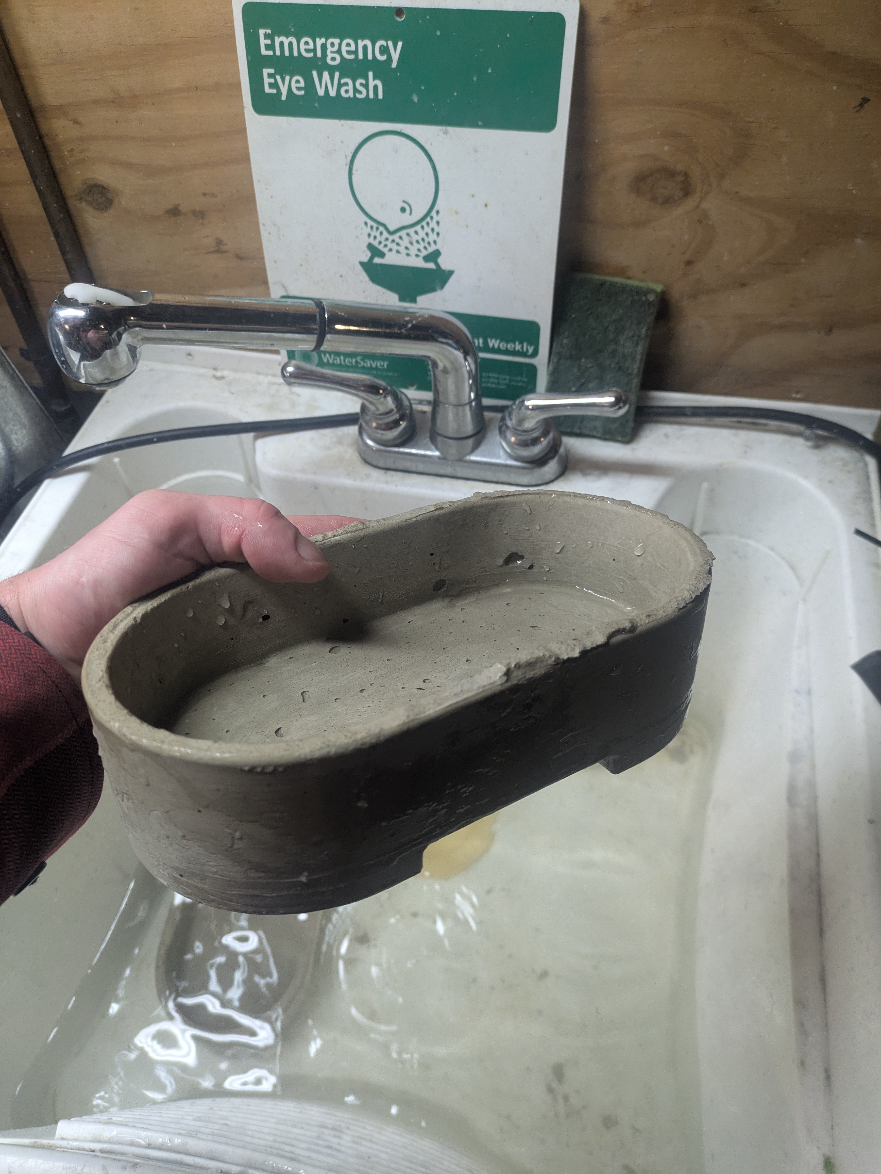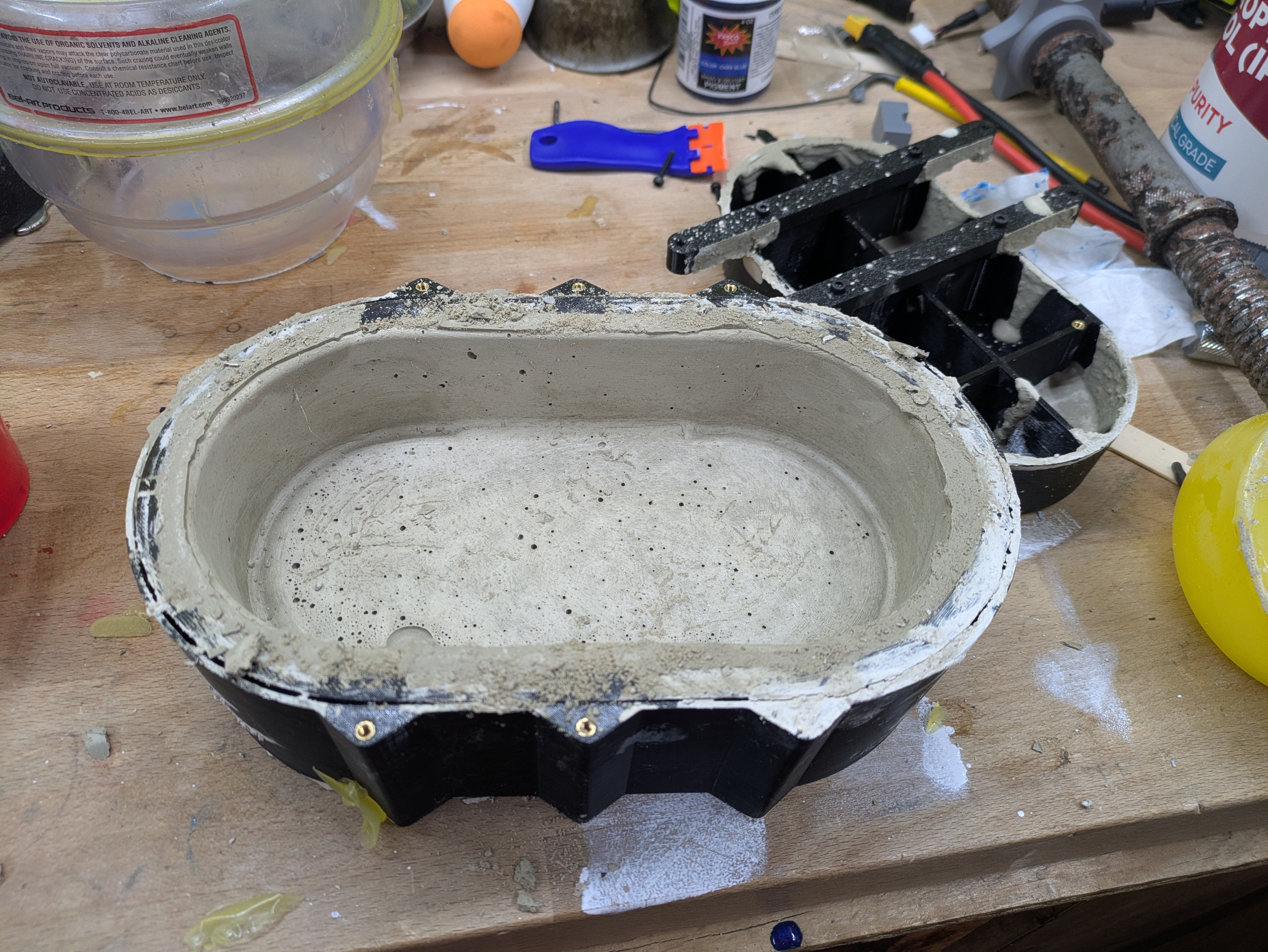 This is a more traditionally shaped, round bonsai pot. Generally speaking, hard materials should be cast into soft molds and vice versa. So I printed a mold mold, cast a silicone mold, then cast concrete into the mold. Urethane is the prefered material for concrete molds because it’s tough enough to be resistant to abrasive concrete and self lubricating enough to release well. I had some spare urethane I used for the outer mold and some expired bucket fulls of silicone I used for the insert.